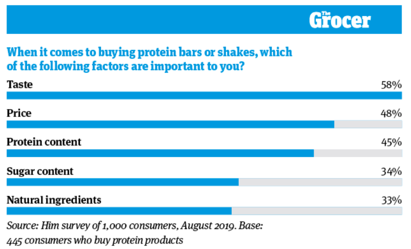 - Taste is the most important attribute in a protein product (58% say this), second is price at 48% and then protein content at 45%.